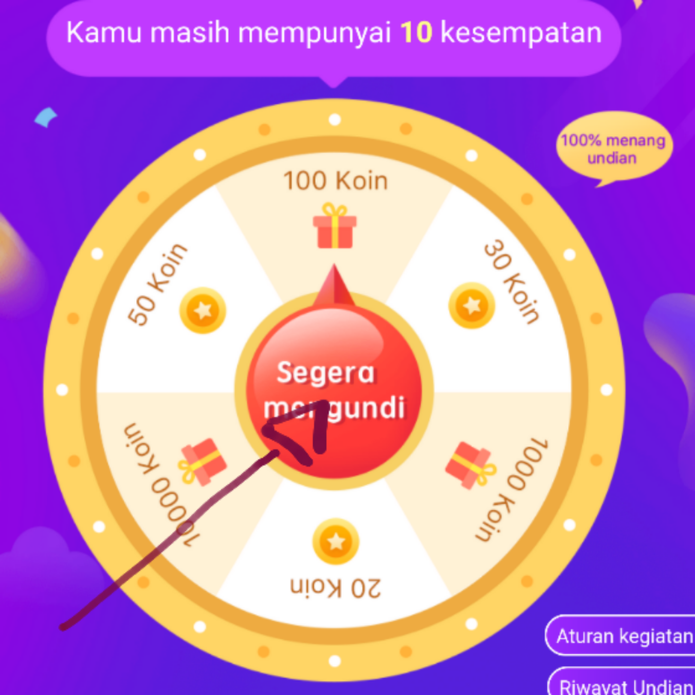 Akan ada 10 kesempatan untuk bermain. Rajinlah check in untuk mendapatkan kesempatan ini.