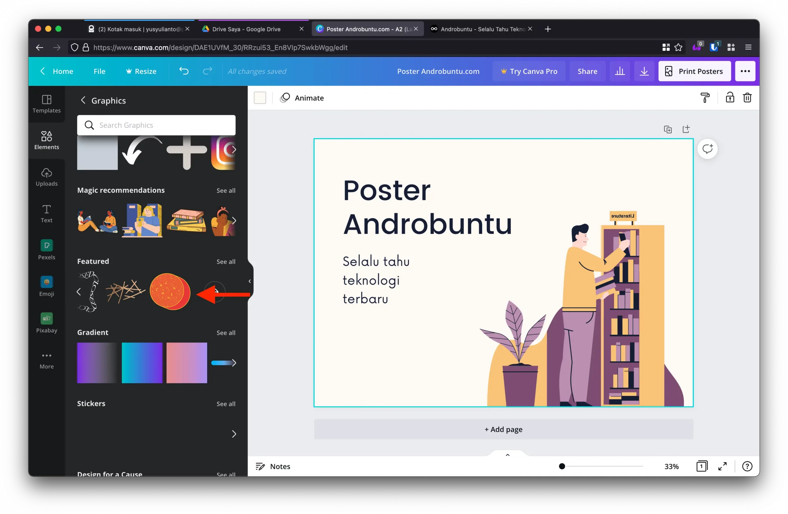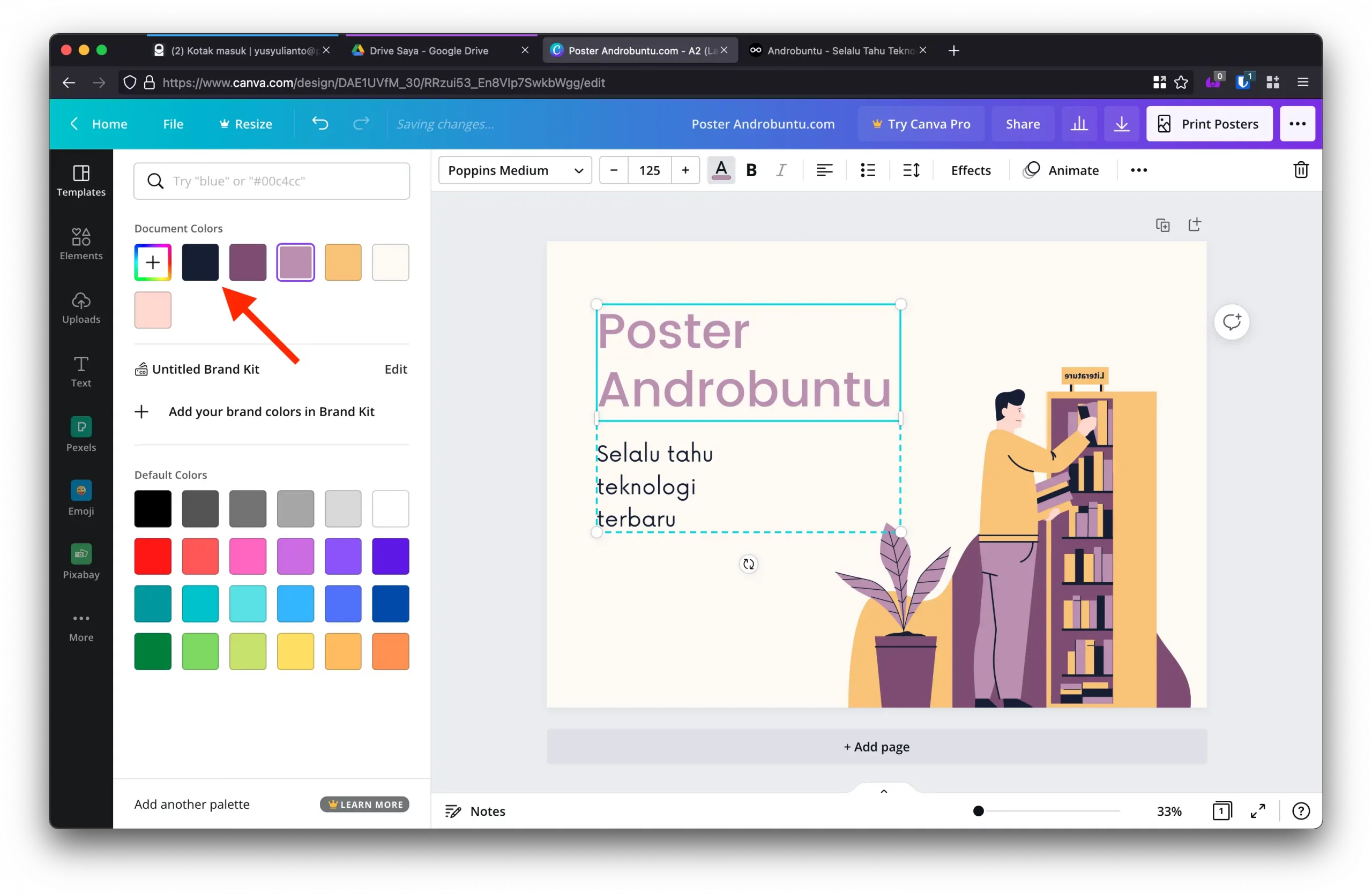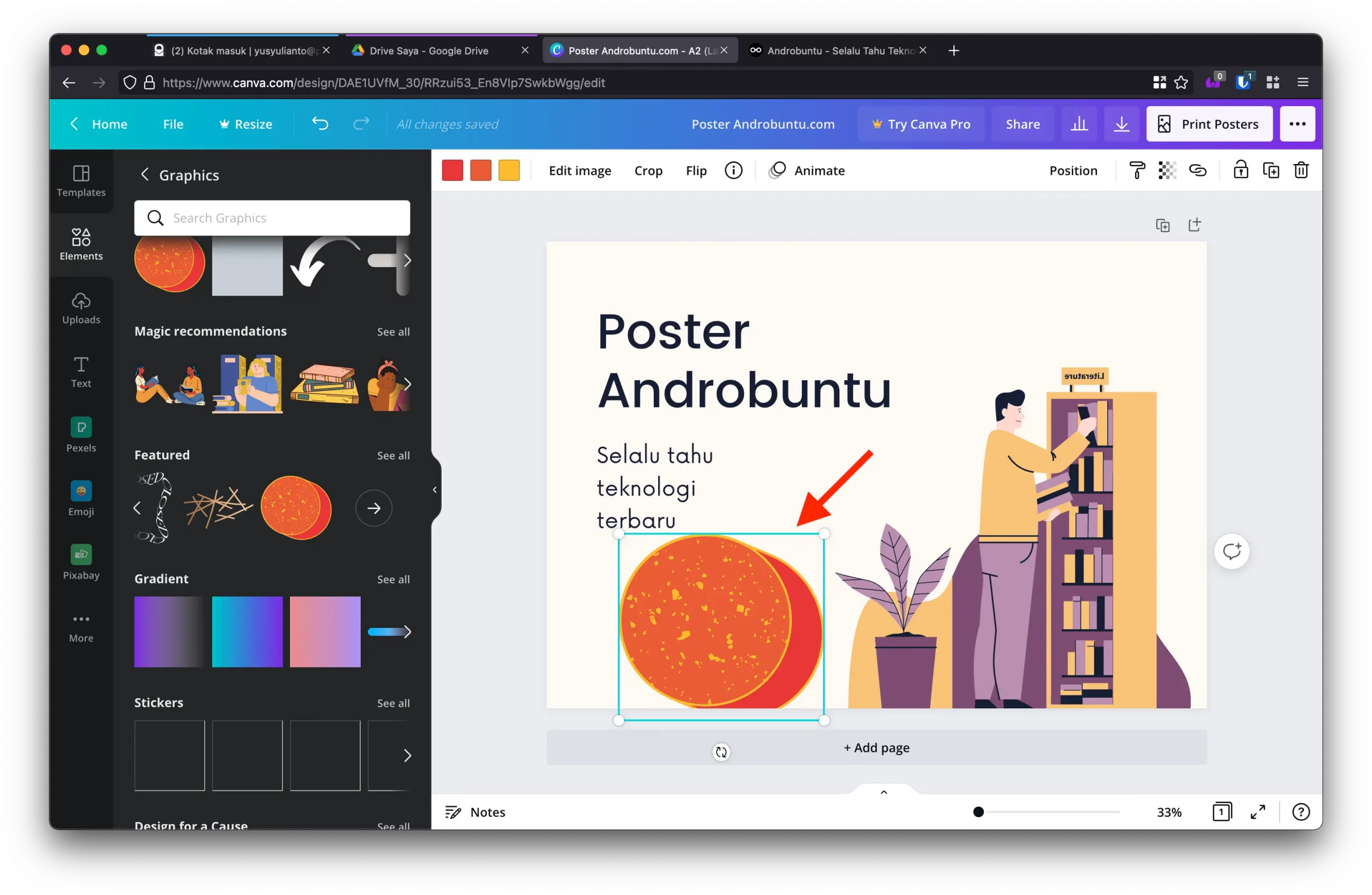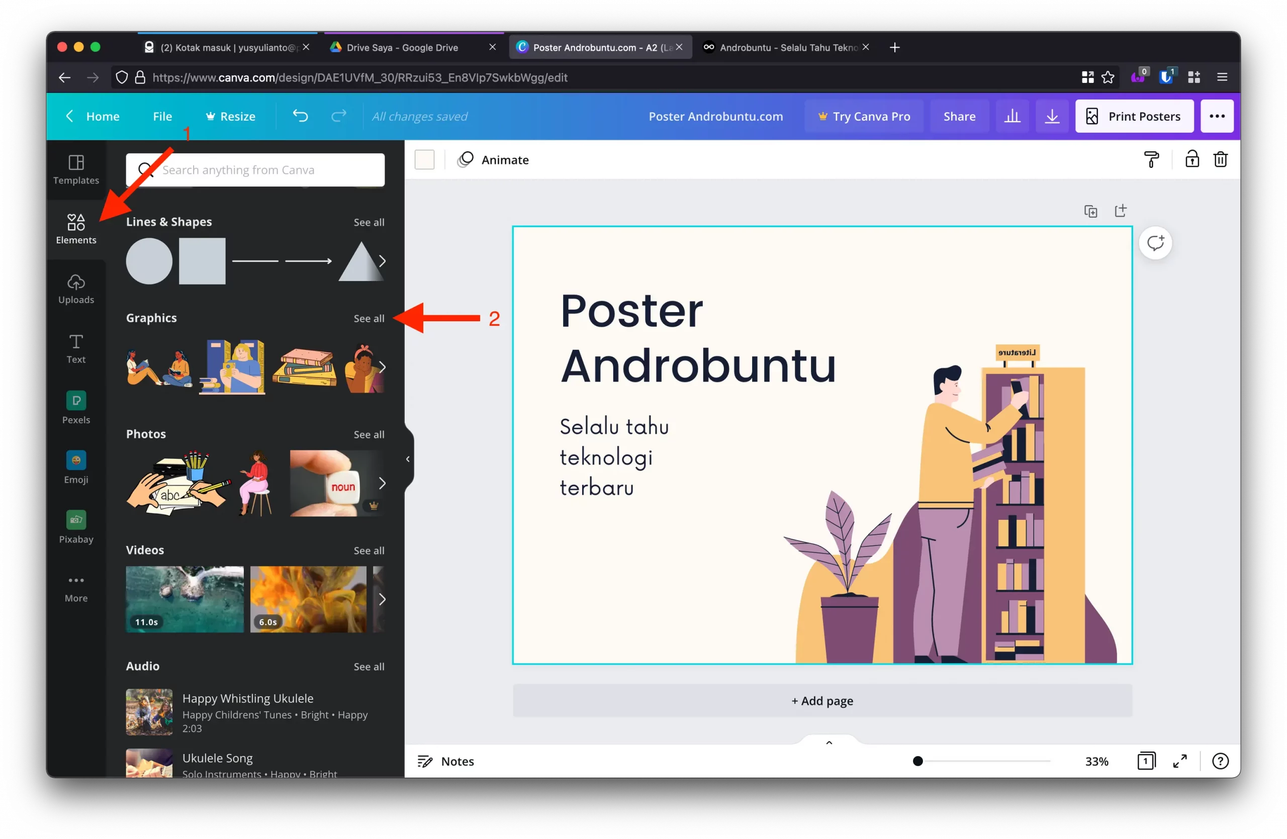 Kita tidak hanya dapat menggunakan foto dan grafik yang tersedia di Canva, namun juga mengunggah foto milik kita sendiri untuk digunakan didalam poster.