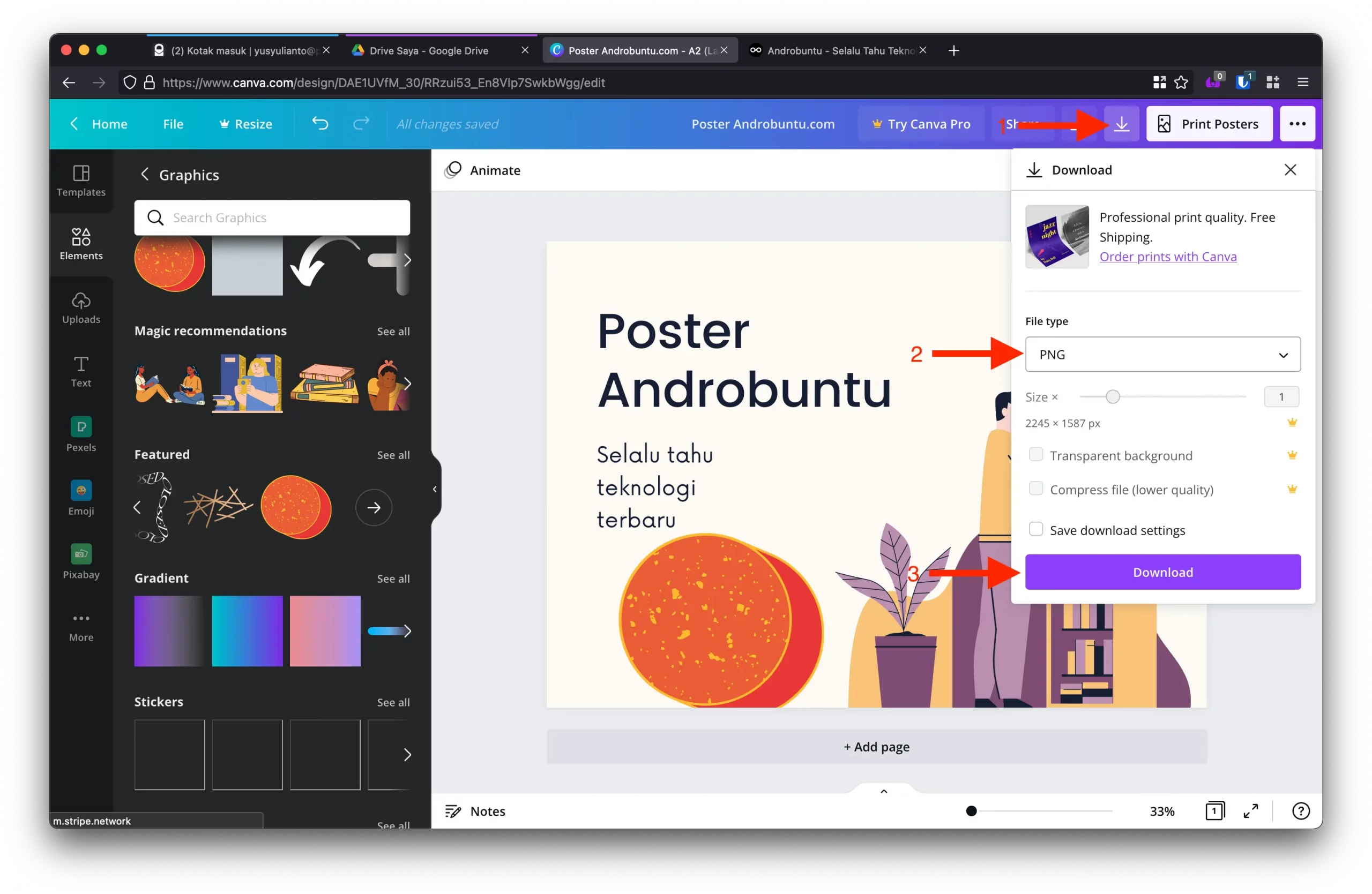 Canva kemudian akan menyimpan poster yang kamu buat dengan format berkas yang tadi sudah kamu pilih.