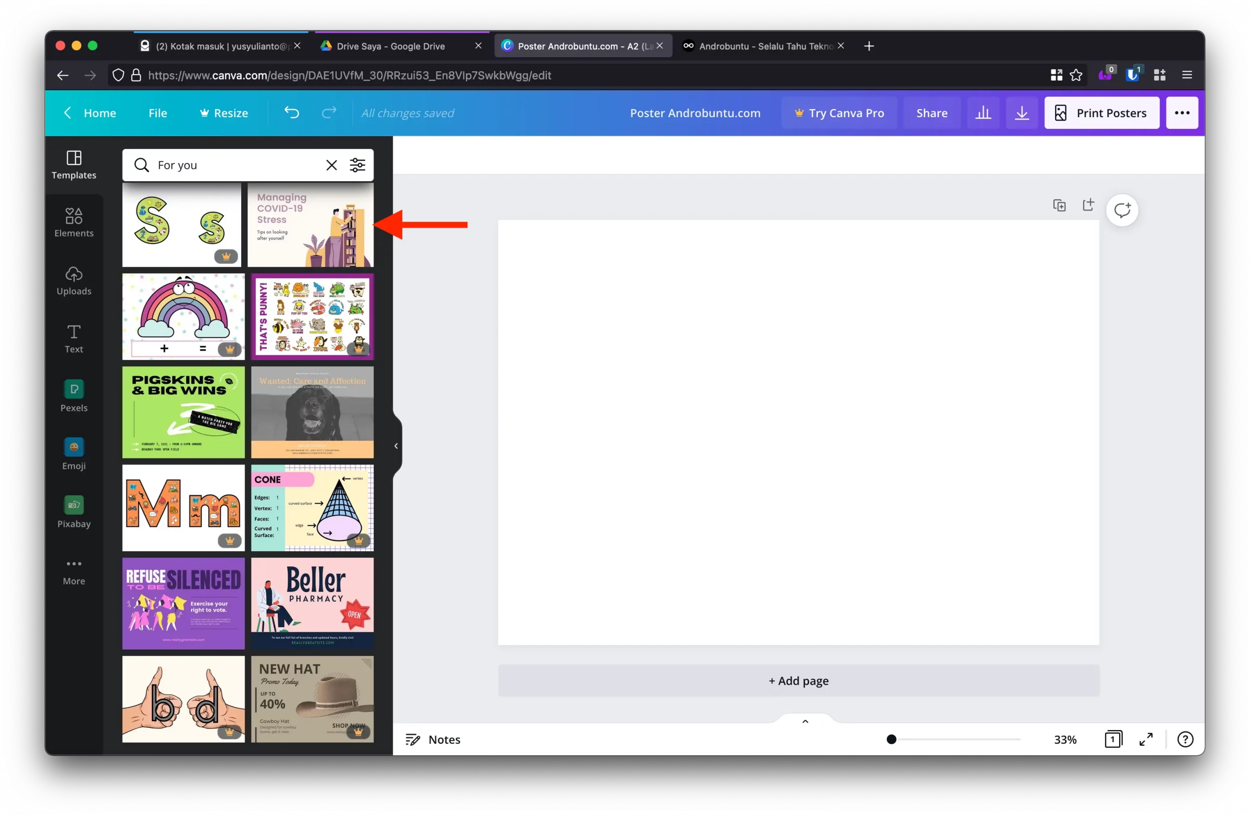 Untuk mempercepat desain poster yang akan kita buat, saya sangat menganjurkan untuk menggunakan template yang sudah ada di Canva.