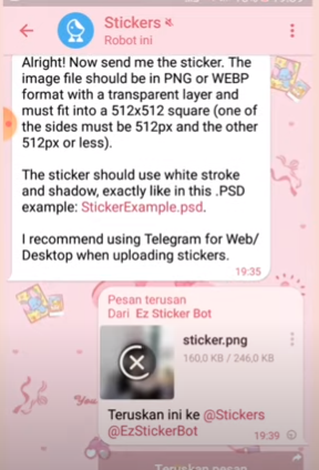 Kamu bisa berbagi stikermu ini bersama teman-teman dengan mengirim alamat tadi. Selama kita sudah menggunakan versi terbaru dari aplikasi Telegram, kita bisa mengunduh stiker tersebut dan menggunakannya.