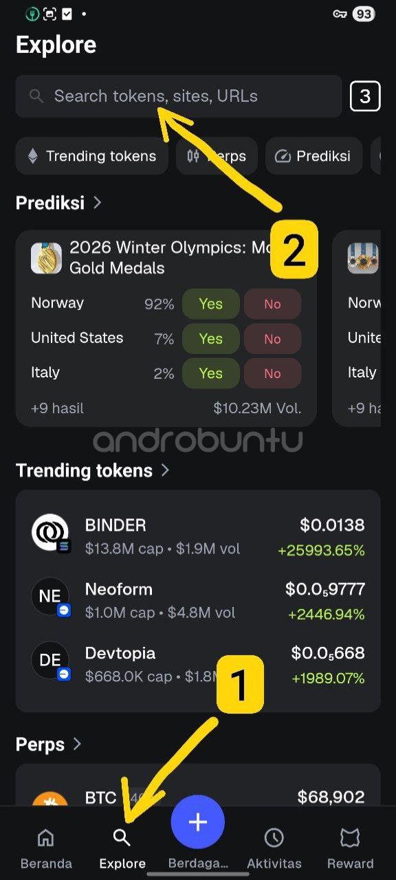 Langkah pertama, buka aplikasi MetaMask kamu. Baik itu di Android ataupun di iPhone, langkah-langkahnya akan sama saja. Setelah MetaMask terbuka, ketuk menu Explore kemudian dibagian paling atas, kamu akan melihat ada kolom “Search token, sites, URLs”.