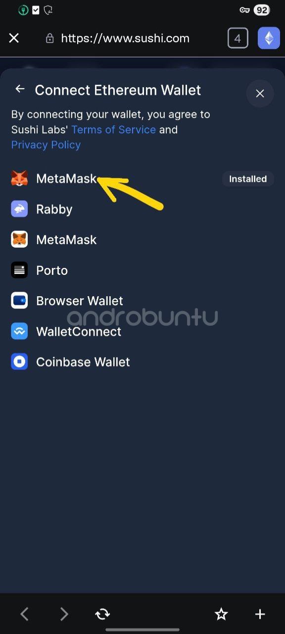 Catatan penting: Kalau kamu menggunakan iPhone dan tidak menemukan menu Browser di MetaMask, kemungkinan karena Apple memang membatasi fitur browser di aplikasi wallet. Solusinya, kamu bisa gunakan browser biasa seperti Safari, lalu akses Sushiswap dari sana dan connect dengan MetaMask melalui WalletConnect. Tapi untuk Android, fitur browser bawaan MetaMask sudah sangat memadai.
