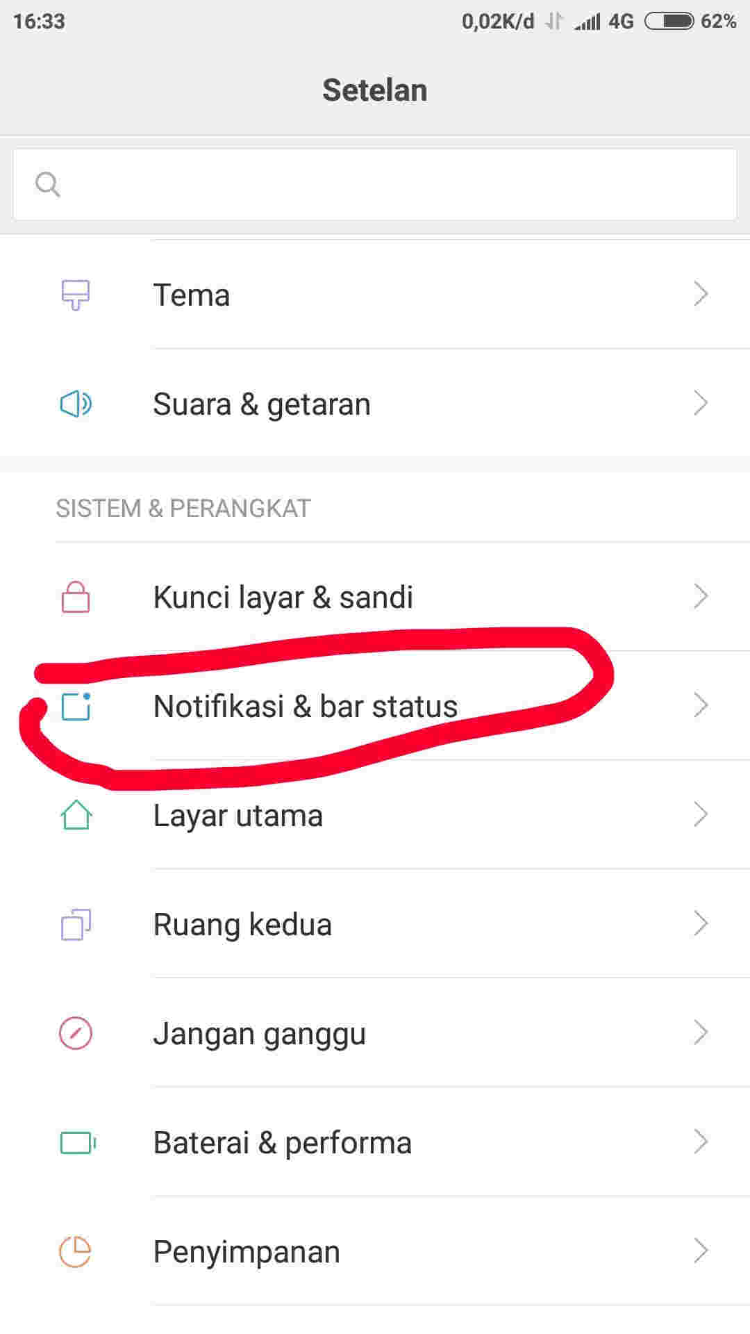 Pertama, masuk ke menu “Setelan”. Lalu pilih opsi “Notifikasi & bar status”.
