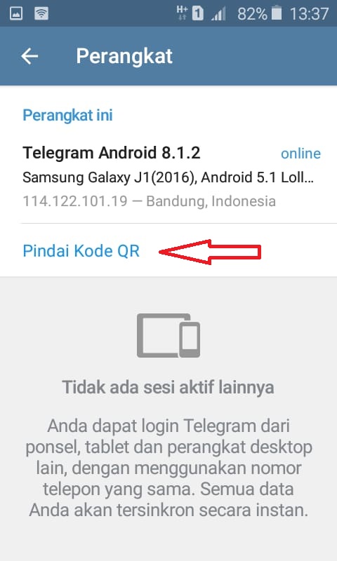 Setelah itu pada tampilan telegram web di bagian bawah akan muncul tab opsi dalam kode QR, klik pada tab